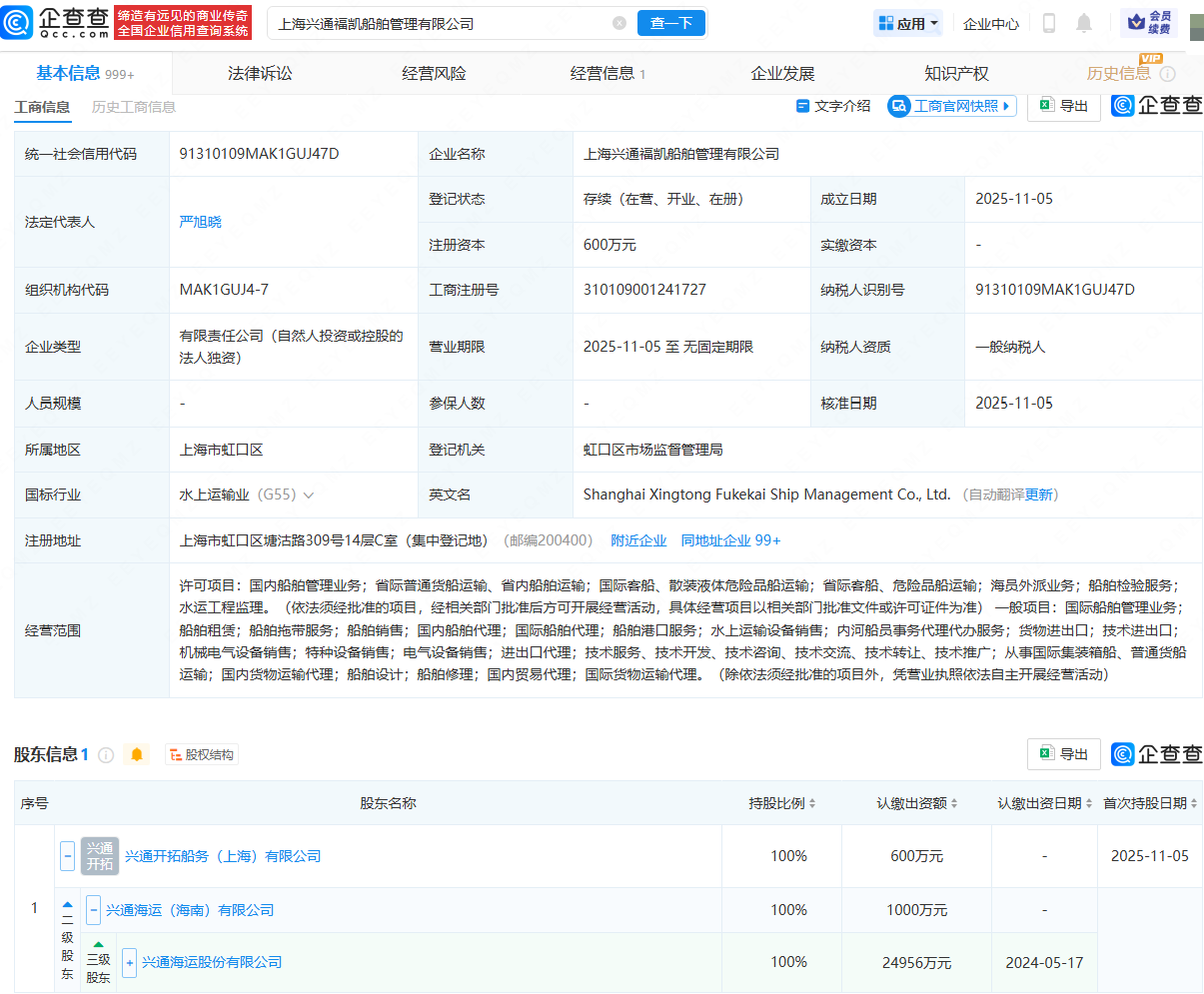 近日,上海兴通福凯船舶管理有限公司成立,法定代表人为严旭晓,经营范围包含:国内船舶管理业务;省际普通货船运输、省内船舶运输;国际客船、散装液体危险品船运输等。企查查股权穿透显示在线配资软件,该公司由兴通股份(603209)间接全资持股。