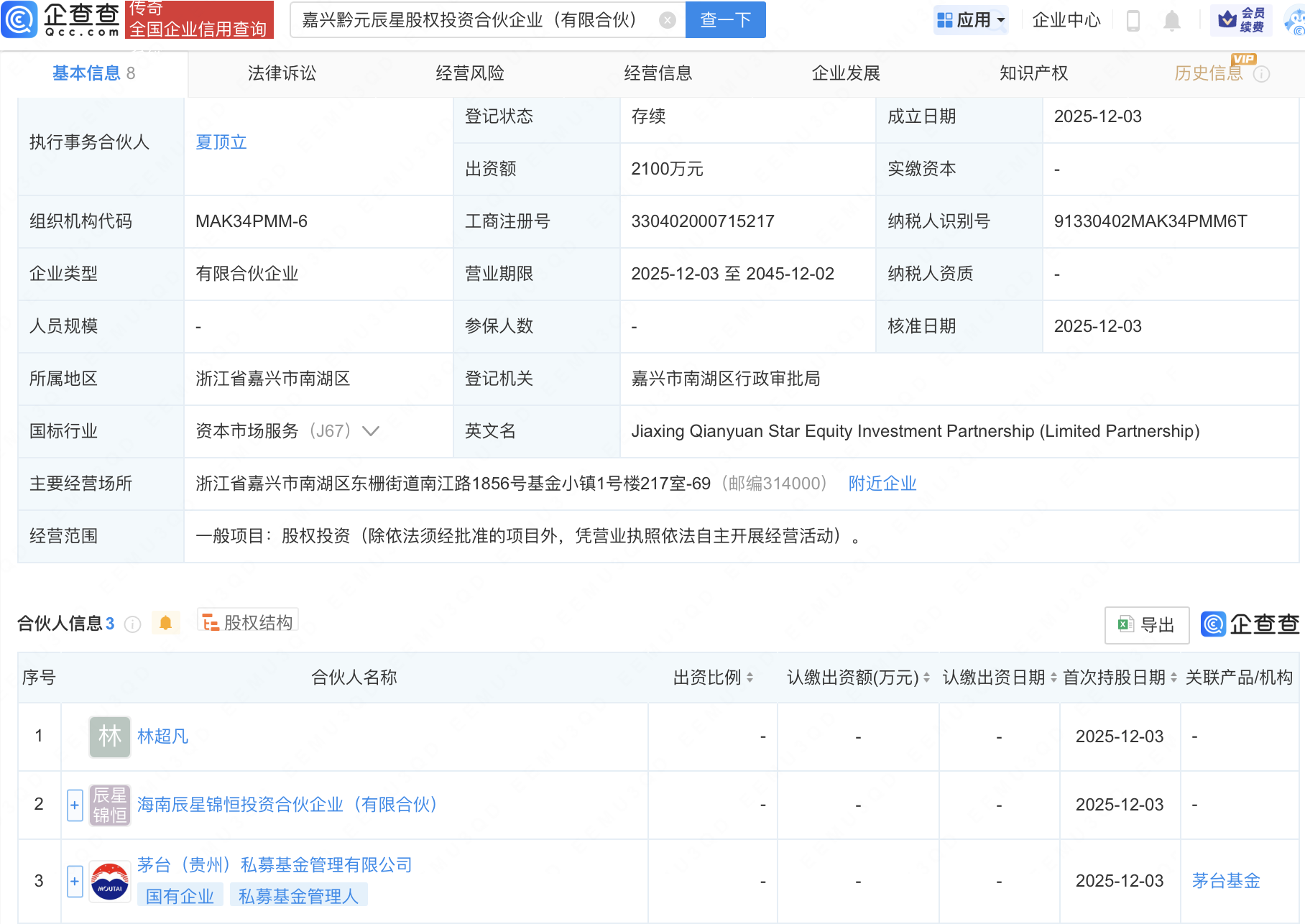近日配资操盘炒股配资开户,嘉兴黔元辰星股权投资合伙企业(有限合伙)成立,出资额2100万元,经营范围包含股权投资。企查查股权穿透显示,该企业由茅台(贵州)私募基金管理有限公司等共同出资。